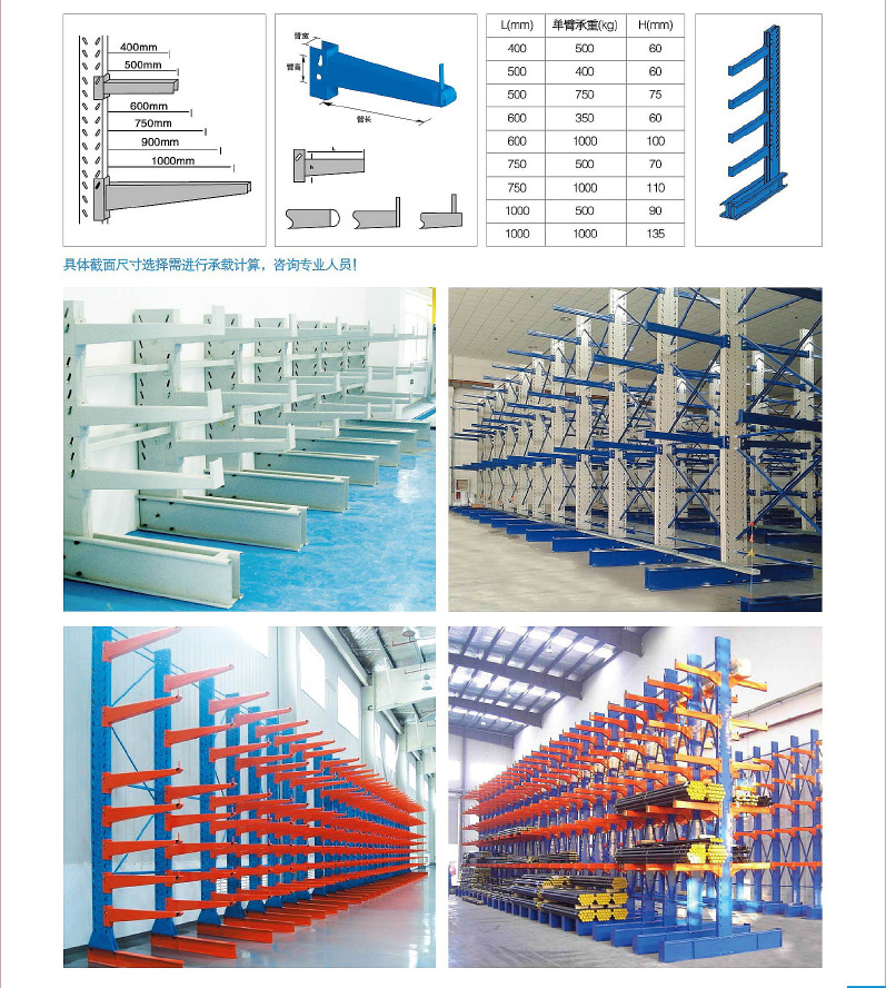 產(chǎn)品介紹: 懸臂式貨架適用于存放長物料、環(huán)形物料、板材、管材、及不規(guī)則貨物。懸臂可以是單面或雙面,懸臂式貨架具有結(jié)構(gòu)穩(wěn)定,載重能力好、空間利用率高等特點(diǎn)。懸臂式貨架立柱采用H型鋼或冷軋型鋼,懸臂采用方管、冷軋型鋼或H型鋼,懸臂與立柱間采用插接式或螺栓連接式,底座與立柱間采用螺栓連接式,底座采用冷軋型剛或H型鋼。