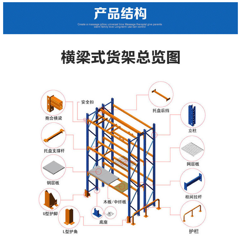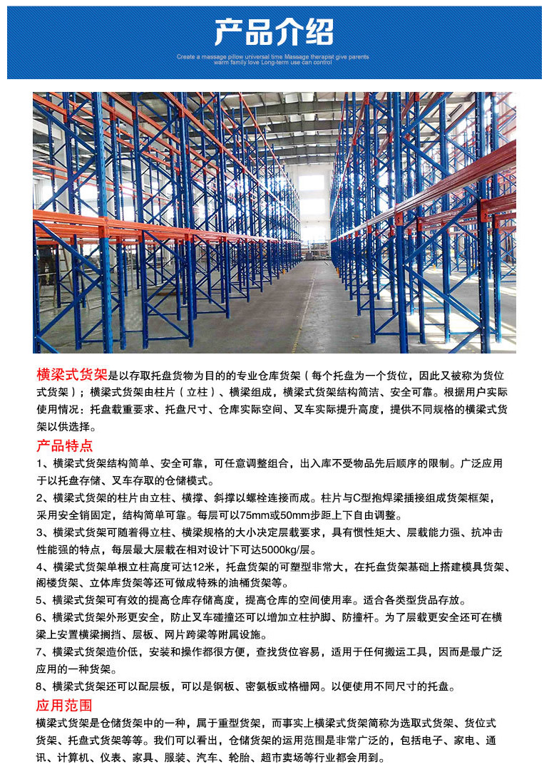 ■能夠以75mm的整數(shù)倍自由調(diào)節(jié)每層層高。    重型(橫梁式)貨架一般采用冷軋異型鋼制作,立柱由80(90)x60(70)Ω型鋼表面沖菱形孔而成,橫梁由80x50-100x50-120x50-140x50-160x50抱焊梁連接掛件而成,一般用托盤代替層板方便叉車搬運。層載重1噸到5噸的設(shè)計,表面靜電噴塑,防水防銹防腐蝕能力更強,安全系數(shù)高,插接式組合,不需要用螺絲和焊接,組裝非常方便,充分利用空間面積,提供倉儲能力。